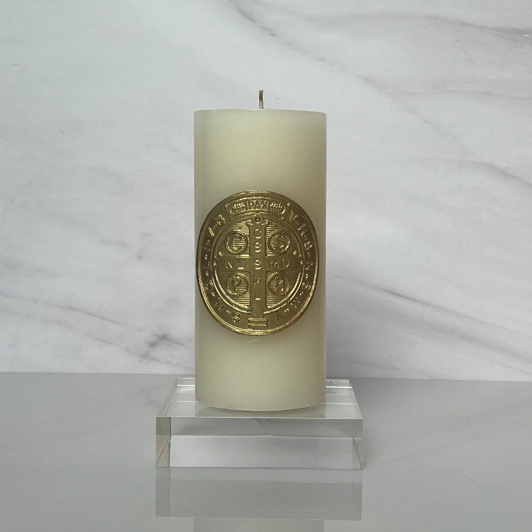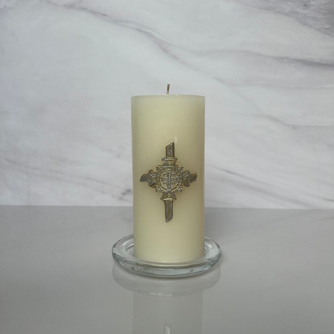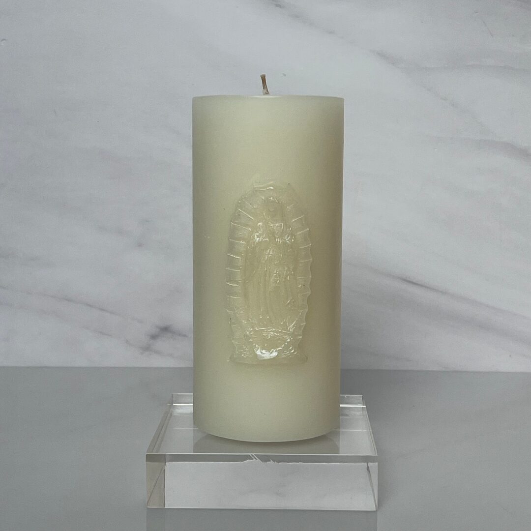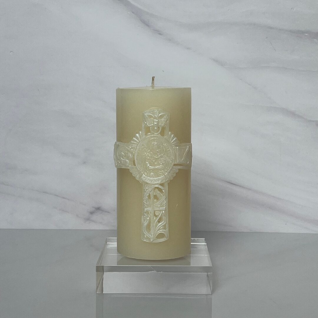 Cirio con 15 cm de alto por 7 cm de ancho, elaborado con parafina de alta. Este cirio puede complementarse con una base decorativa.