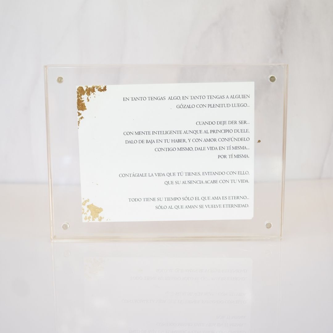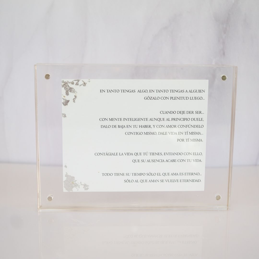 Marco de acrílico transparente acompañado de una frase especial que ilumina cada espacio.
